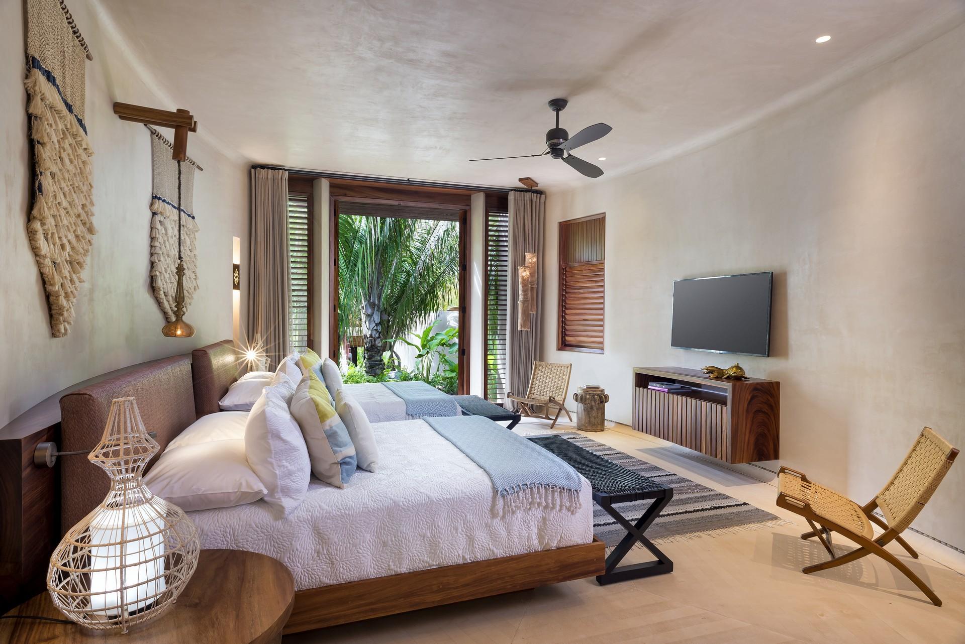 - Bedroom 6: Two queen beds, en suite bathroom with rain shower, al fresco shower, over-sized vanity, walk-in closet, shared patio, garden deck, TV, telephone, bathrobes, hair dryer, safety deposit box, ceiling fan, AC, wifi